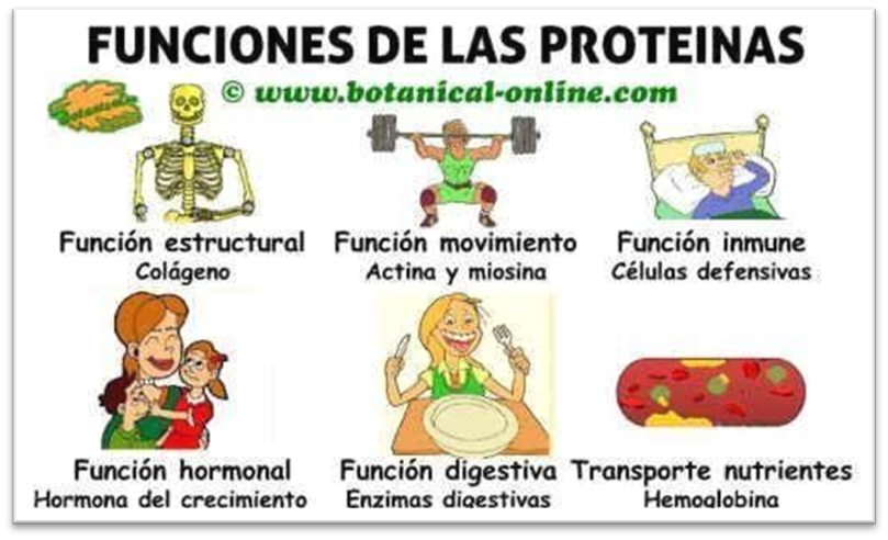 Las proteínas son compuestos formados por carbono (C), hidrógeno (H), oxígeno (O) y nitrógeno (N), aunque pueden contener también azufre (S), fósforo (P) y rara vez calcio (Ca) y yodo (I). Están constituidas por estructuras llamadas aminoácidos. Nueve de estas unidades son conocidos como aminoácidos esenciales porque son indispensables para la síntesis de tejidos, hormonas, enzimas entre otros. Éstos se obtienen de los alimentos, ya que el cuerpo humano no puede sintetizarlos. En la figura 1 se muestran algunas de las funciones de las proteínas.