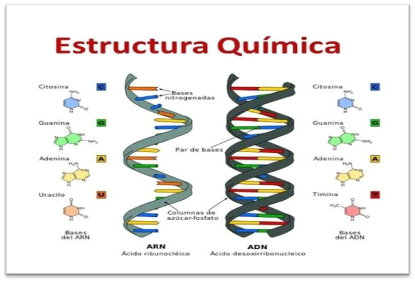 El ácido desoxirribonucleico (ADN) es la molécula hereditaria y se encuentra en los cromosomas de todos seres vivos. Está formada por dos cadenas de nucleótidos colocadas en forma de espiral. Los nucleótidos del ADN están formados por un grupo fosfato, una azúcar de cinco carbonos llamado Desoxirribosa y bases nitrogenadas (adenina, guanina, citosina y timina). Observa la estructura del ADN en la figura 2.
